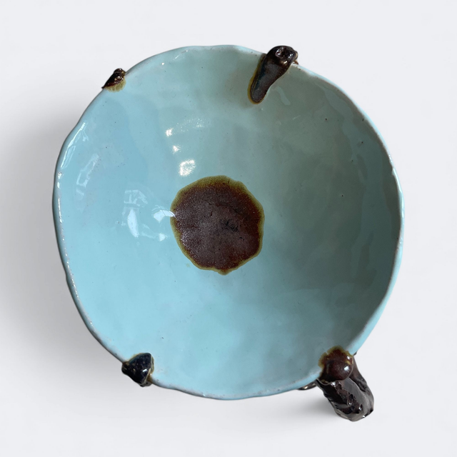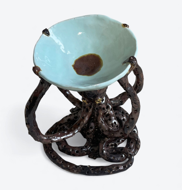 Un poulpe qui soutient une coupe décorative tel les caryatides qui soutenaient un temple. Pièce unique en faience modelée entièrement à la main, puis émaillée. Céramique - Faience émaillée - poudre d'or - usage décoratif - hauteur 18 cm, largeur 16 cm, profondeur 16 cm
