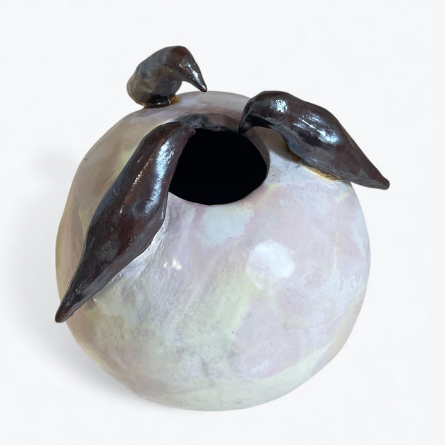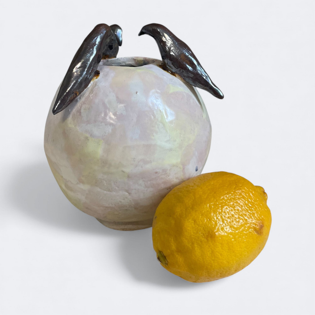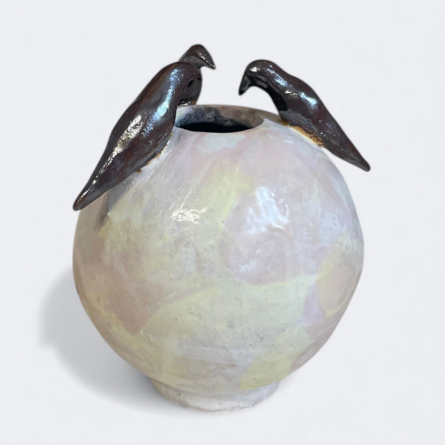 Vase boule surmonté de 3 moineaux très curieux...Pièce unique en faience modelée entièrement à la main, puis émaillée.